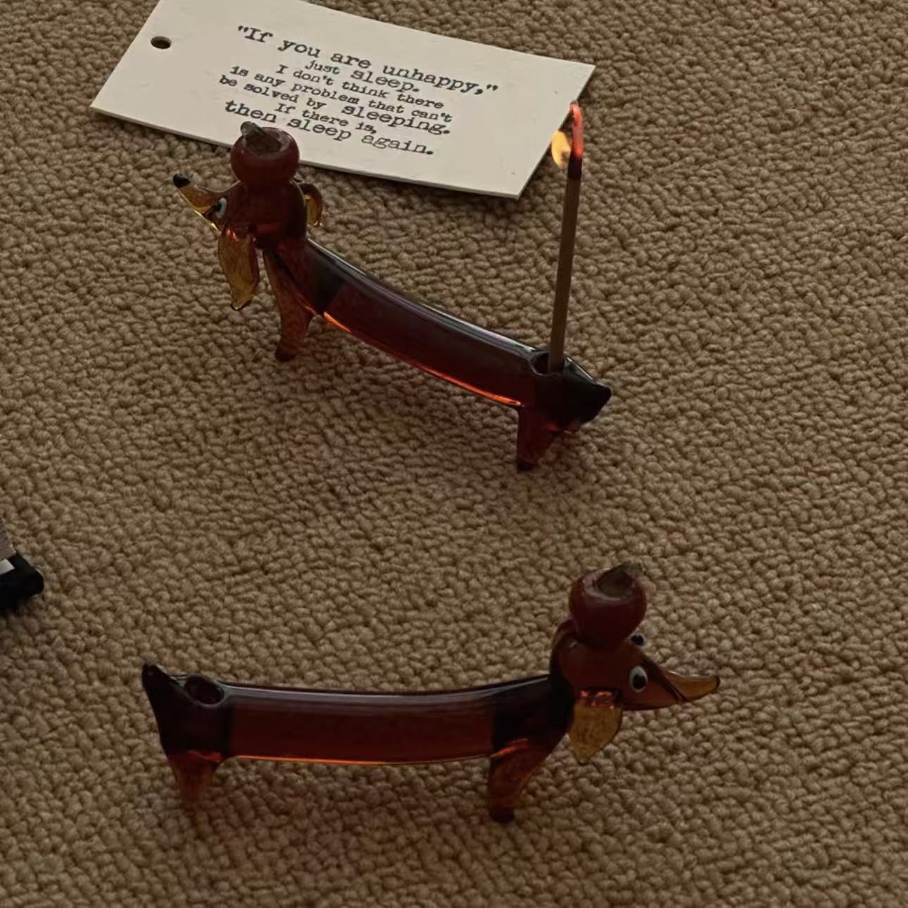 A hand-shaped glass incense holder crafted in the playful silhouette of a small dachshund balancing an apple on its head.